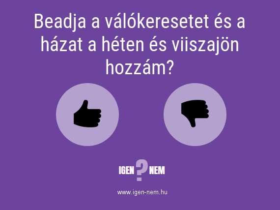 Beadja a válókeresetet és a házat a héten és viiszajön hozzám? IGEN? NEM? | igen-nem.huA válaszadók 100%-a mondta, hogy IGEN. Eddig 1 szavazat érkezett.