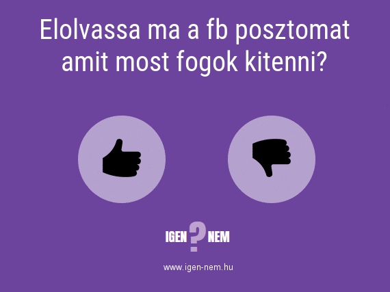 Elolvassa ma a fb posztomat amit most fogok kitenni? IGEN? NEM? | igen-nem.huA válaszadók 100%-a mondta, hogy IGEN. Eddig 1 szavazat érkezett.